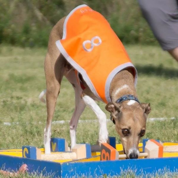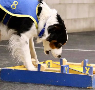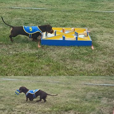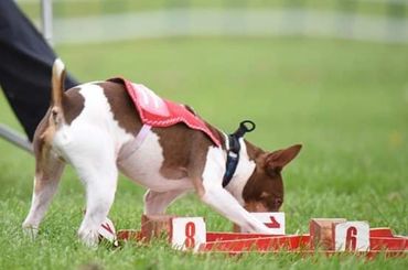 Scent Hurdle Racing is a relay race between two teams of four dogs. Dogs race over a series of three or four hurdles to a scent box which contains four dumbbells. The dog runs up the lane, retrieves a specific numbered dumbbell, and returns down the lane to the owner. As soon as the first dog returns the next dog in the team is released to start up the lane to the scent hurdle box. Fastest team of 4 dogs to correctly complete the race wins!